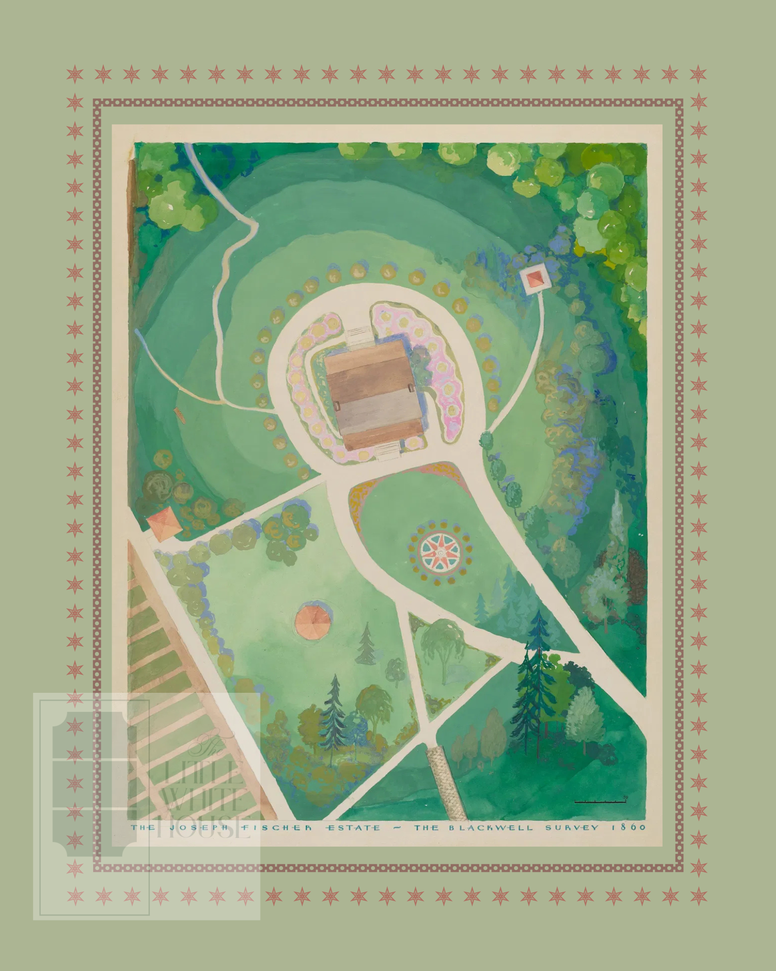 Giclee prints of ER Blackwell recolored 1860s surveys of Manhattan estates on archival matte stock paper. Finished print size 8x10, including the green ground with decorative border and will fit inside an 8x10 frame. This specific Survey is of the Joseph Fischer Estate.