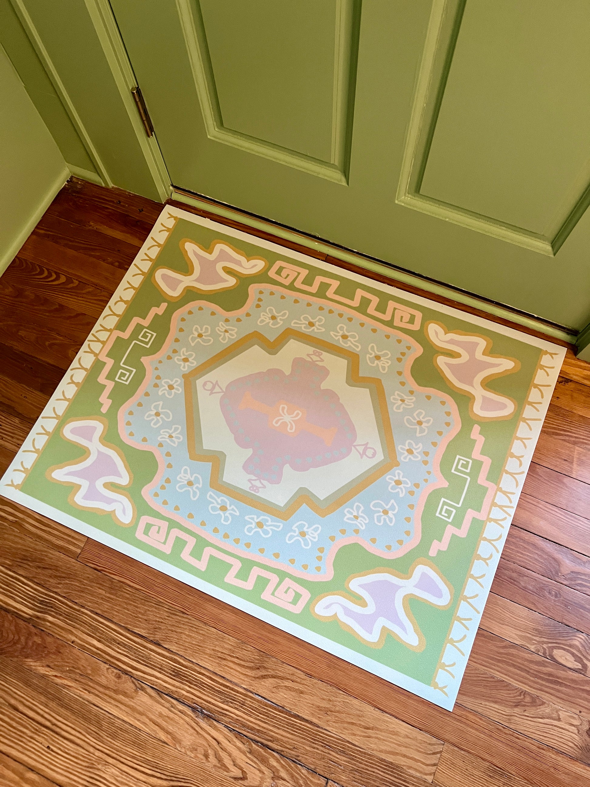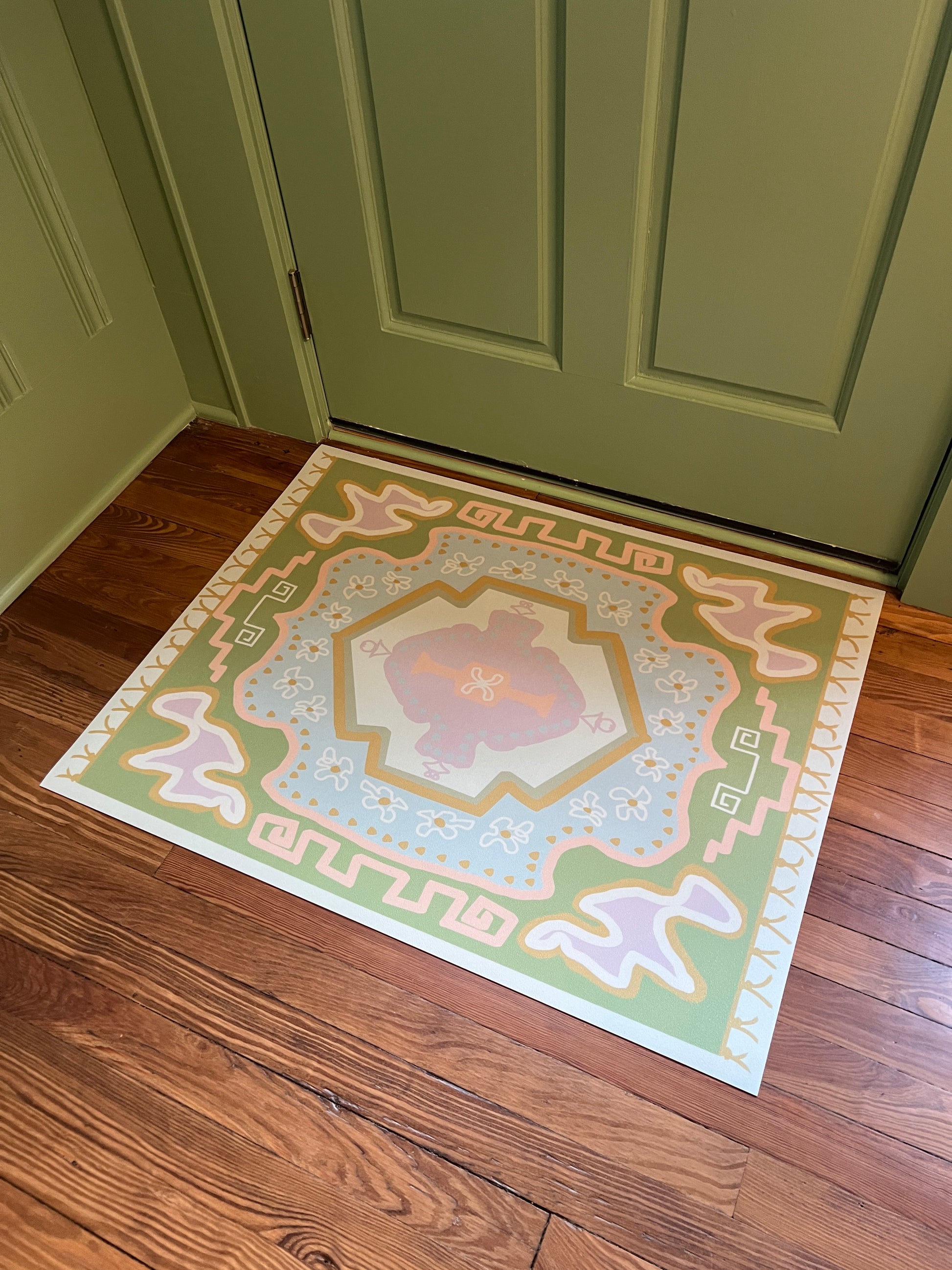 28"x36" vinyl runner in our hand drawn "Royal" design. Art hand drawn & designed by Jenny Kramer, interior designer, as she created items for her own home. Fun & happy colors, with a bright modern oushak type design and long lasting durability. It can handle all that an active family life can throw at it: think muddy boots, messy kids and pets. Yes, Durable can be pretty!