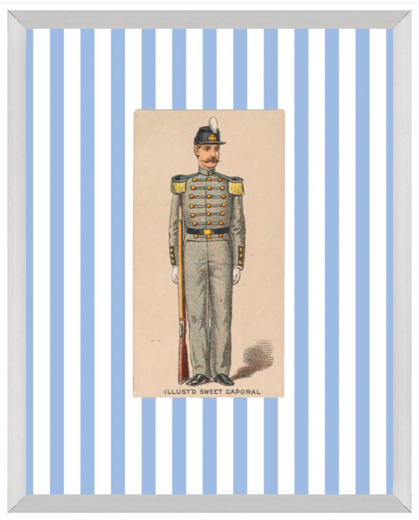 Looks great on its own or in a grouping. Each solider sits differently upon the ground design as it keeps its original shape and form. The background stripe gives the illusion of a decorative mat and gives continuity to the unique soldier prints. (Watermark is not on delivered print).