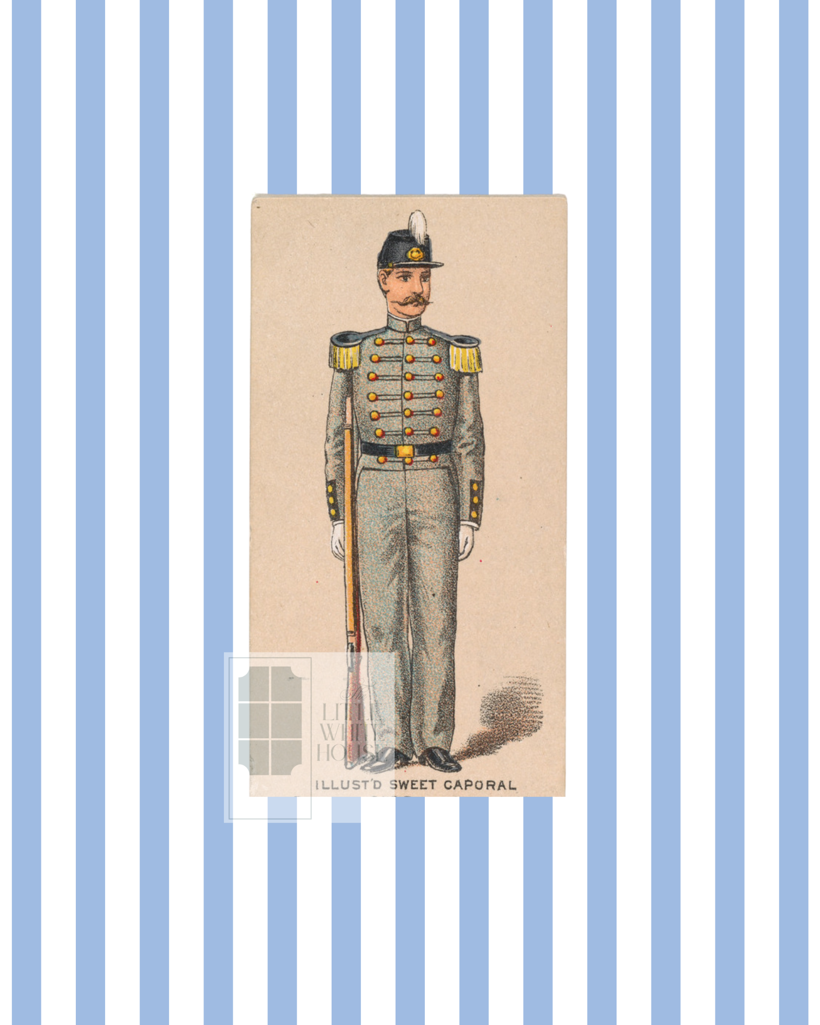 Vintage Soldier in Uniform on blue and white patterned ground Giclee print on thick archival matte paper- finished size 8x10